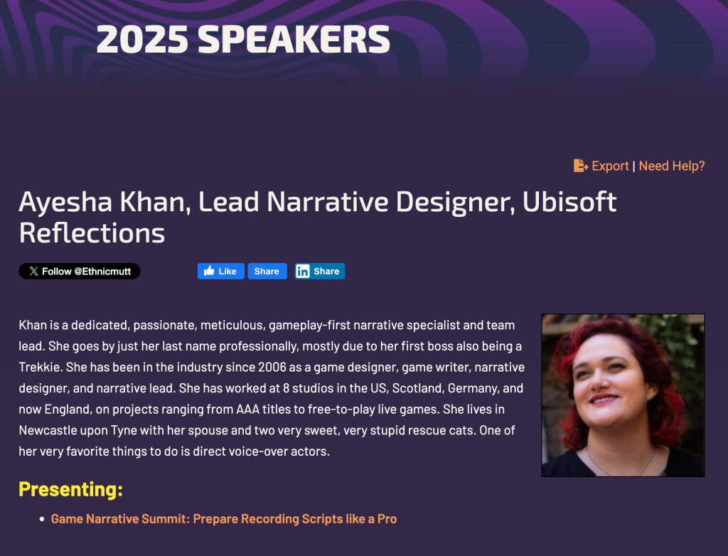 This talk should provide an understanding of what actors actually need from your scripts and what they don’t, why those elements help or hinder, and how to leave room for co-creation with the talent while still getting the performance you need, even when you’re not personally directing the recording sessions.